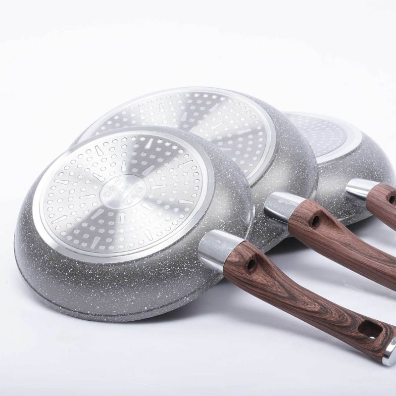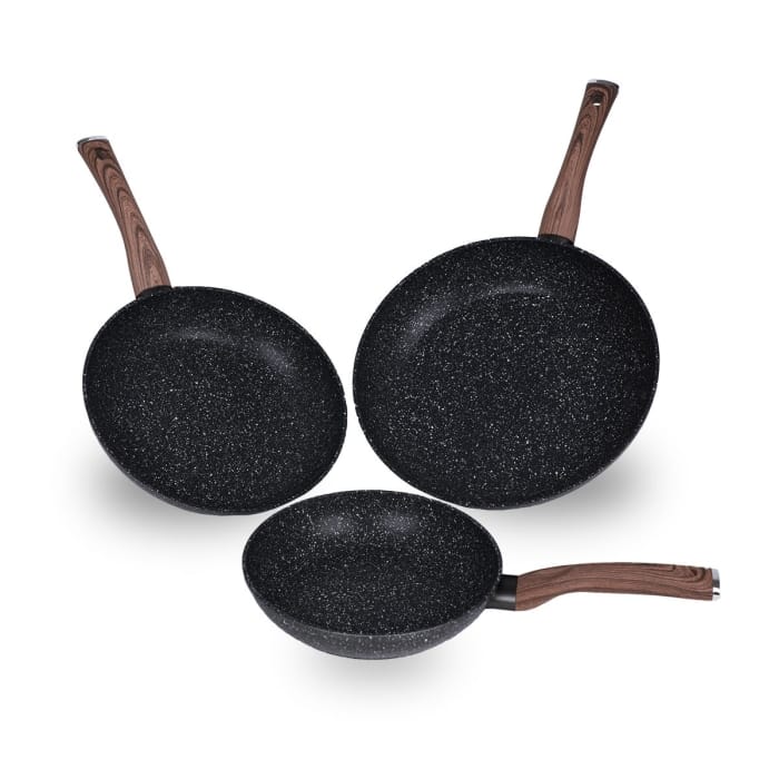 Découvrez notre ensemble de 3 poêles en granite avec manche en bois. Ces poêles de différentes tailles (20 cm, 24 cm, 28 cm) sont idéales pour cuisiner une variété de plats.