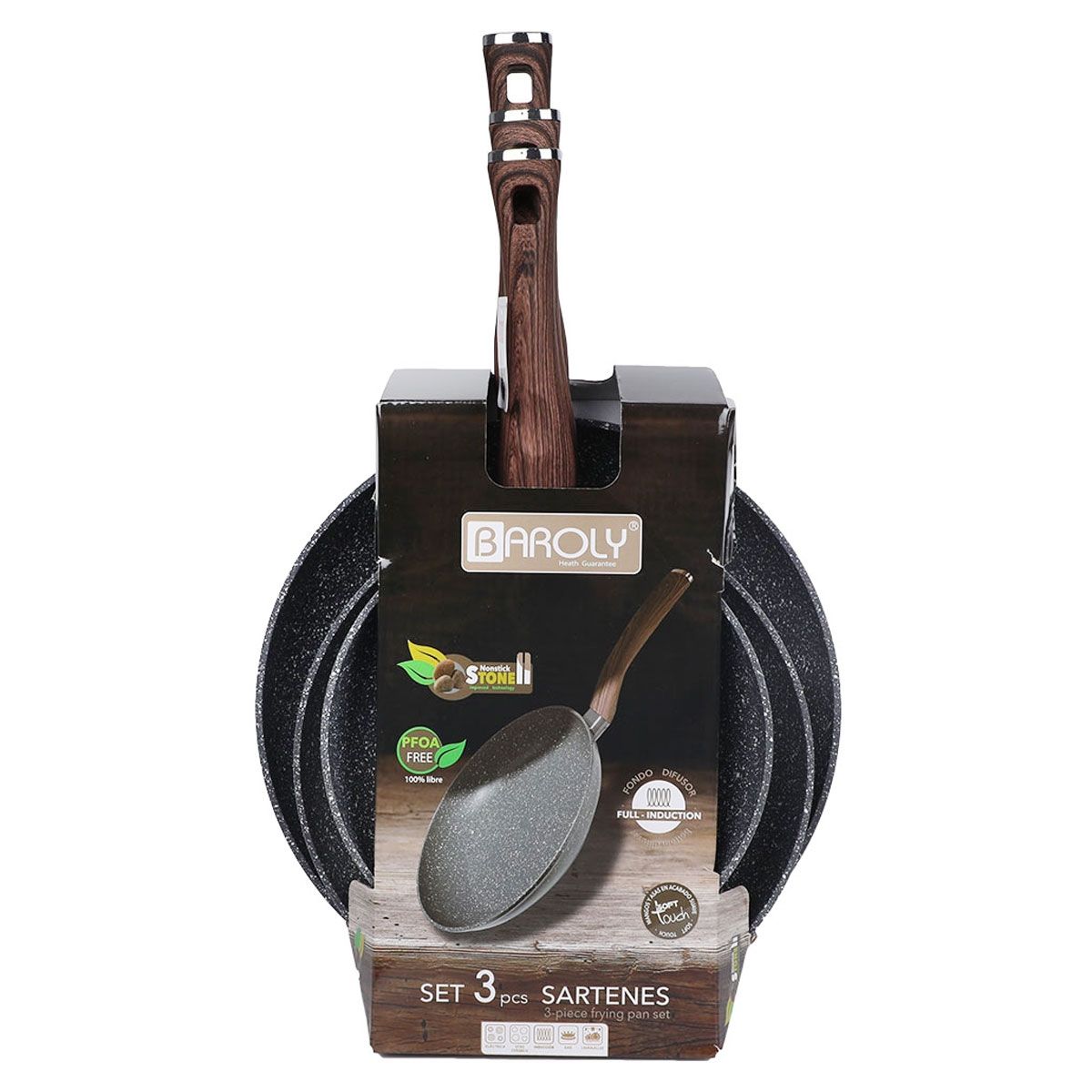 La série de 3 poêles en granite de la marque BAROLY présente des caractéristiques distinctives qui en font un ensemble de cuisine à la fois pratique et élégant.