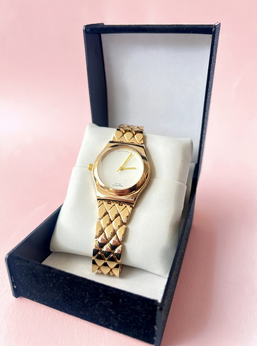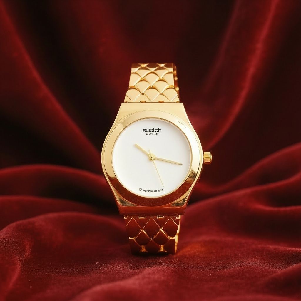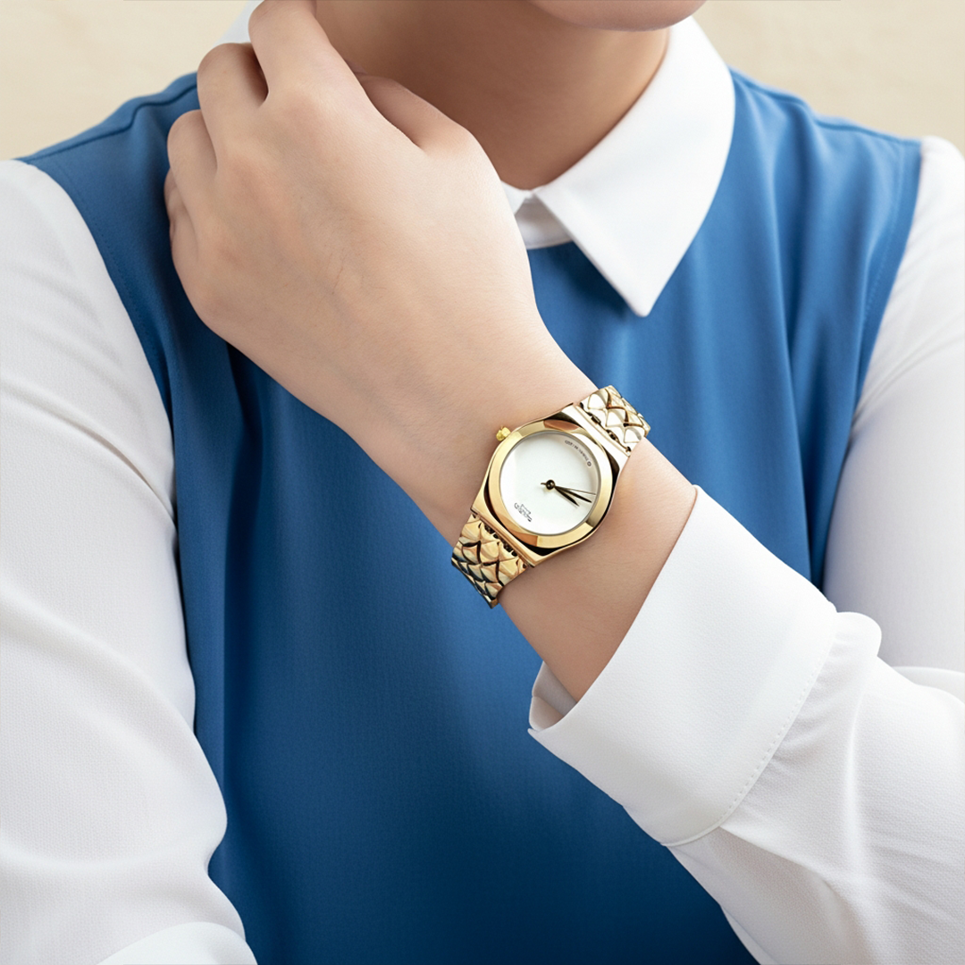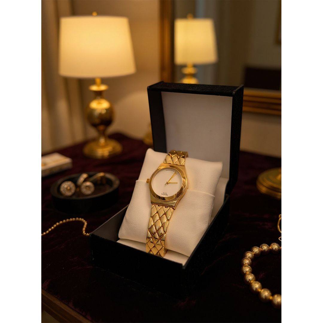 Cette montre se distingue par son boîtier rond couleur dorée aux lignes douces et harmonieuses, associé à un cadran blanc minimaliste qui offre une lecture claire et élégante de l’heure. Les aiguilles fines dorées ajoutent une touche de sophistication discrète, idéale pour un style chic et intemporel.