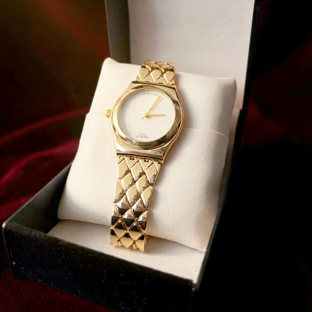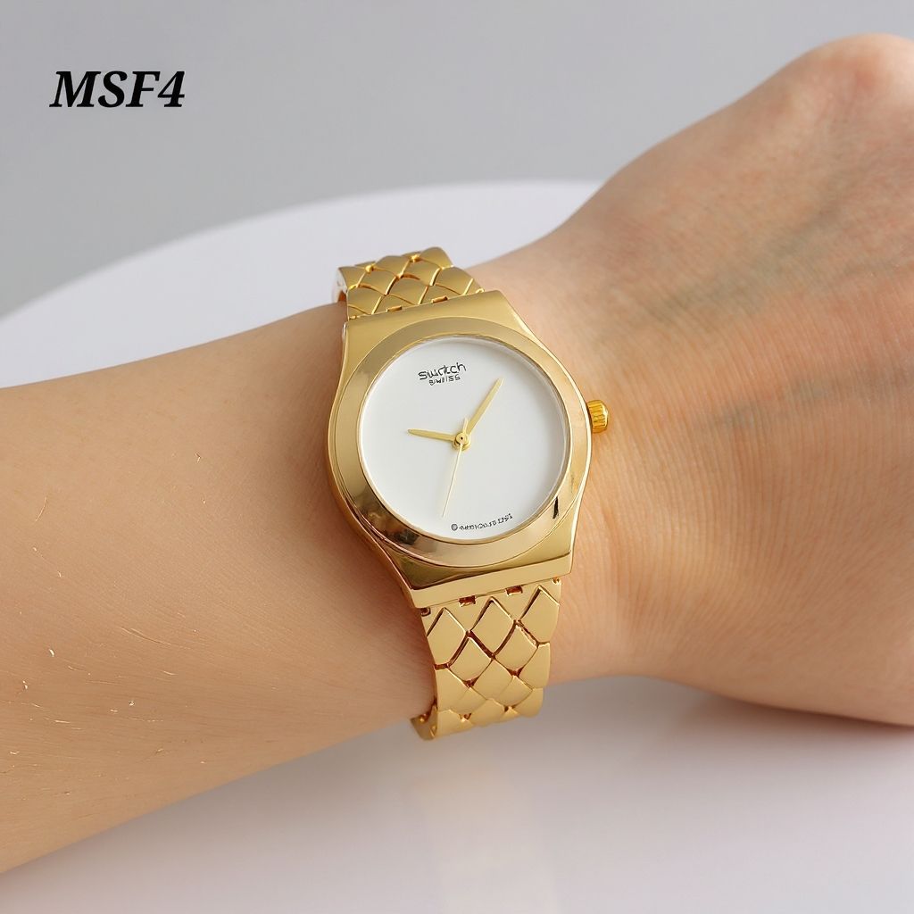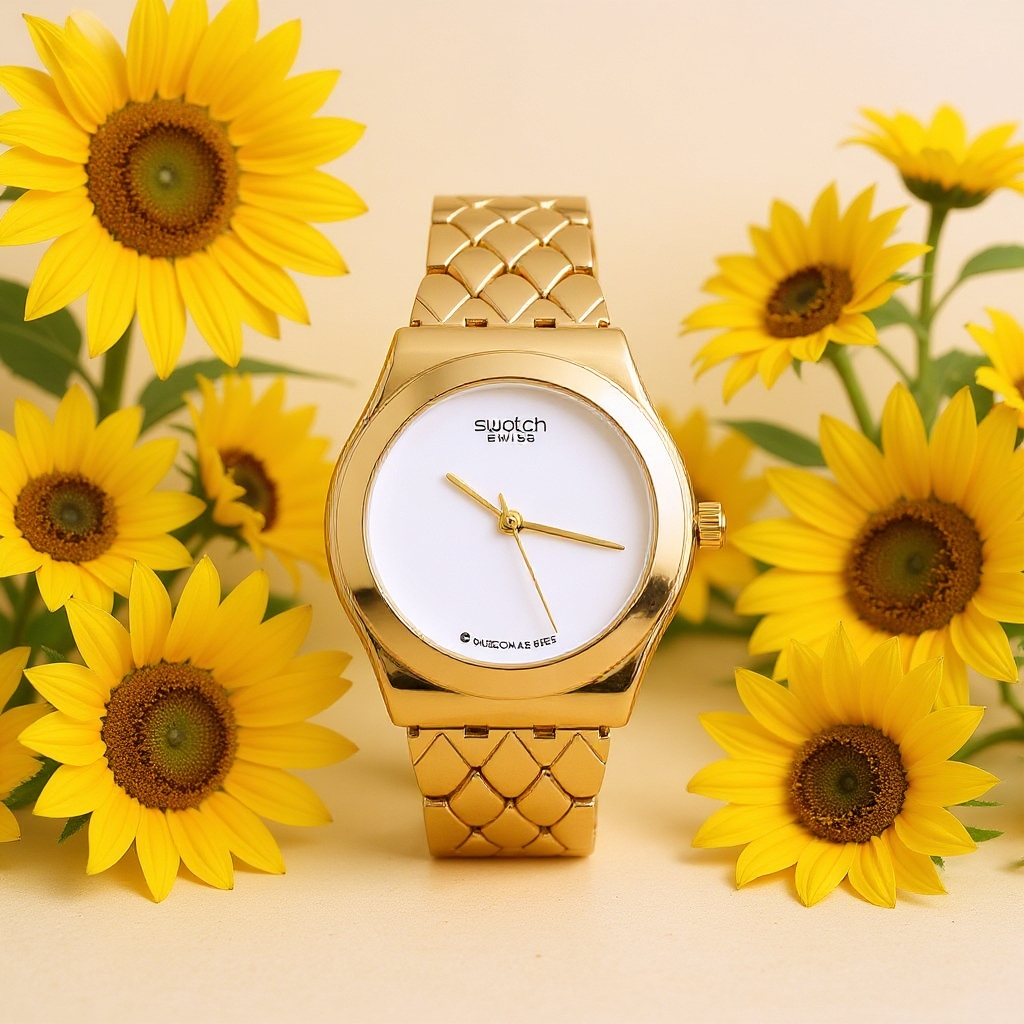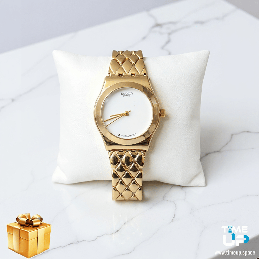 Cette montre se distingue par son boîtier rond couleur dorée aux lignes douces et harmonieuses, associé à un cadran blanc minimaliste qui offre une lecture claire et élégante de l’heure. Les aiguilles fines dorées ajoutent une touche de sophistication discrète, idéale pour un style chic et intemporel.