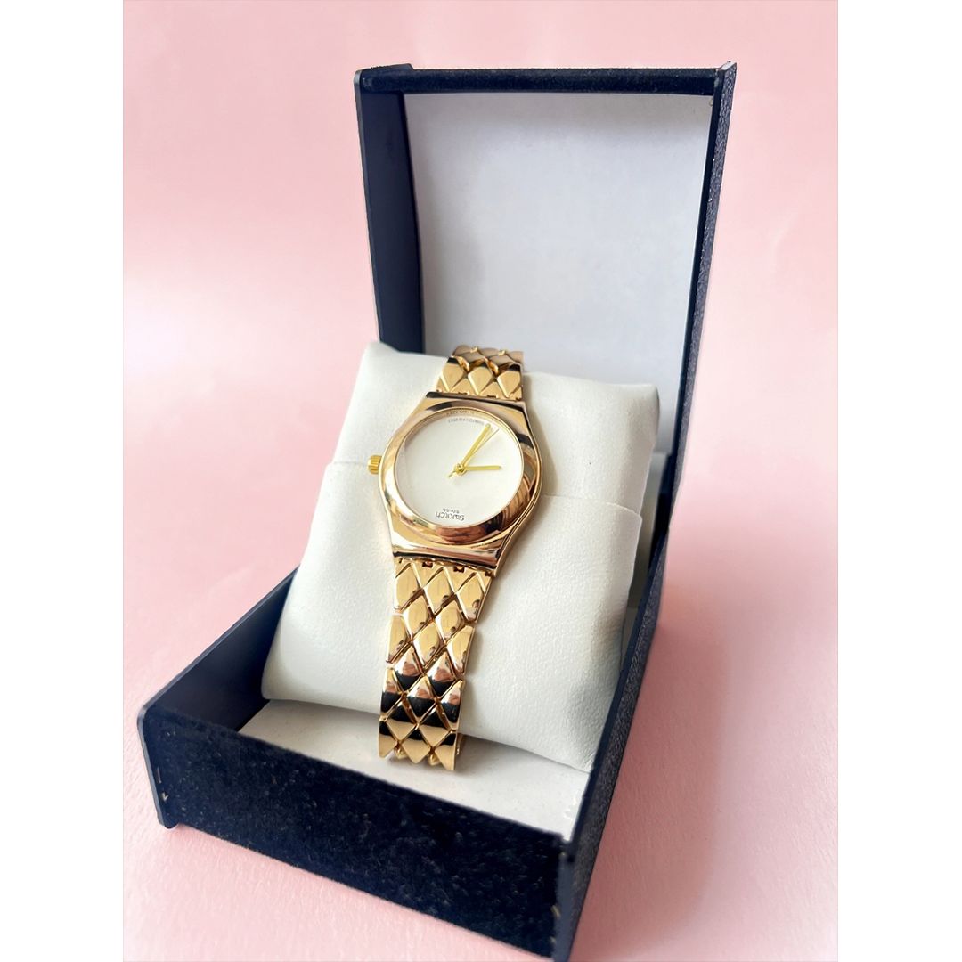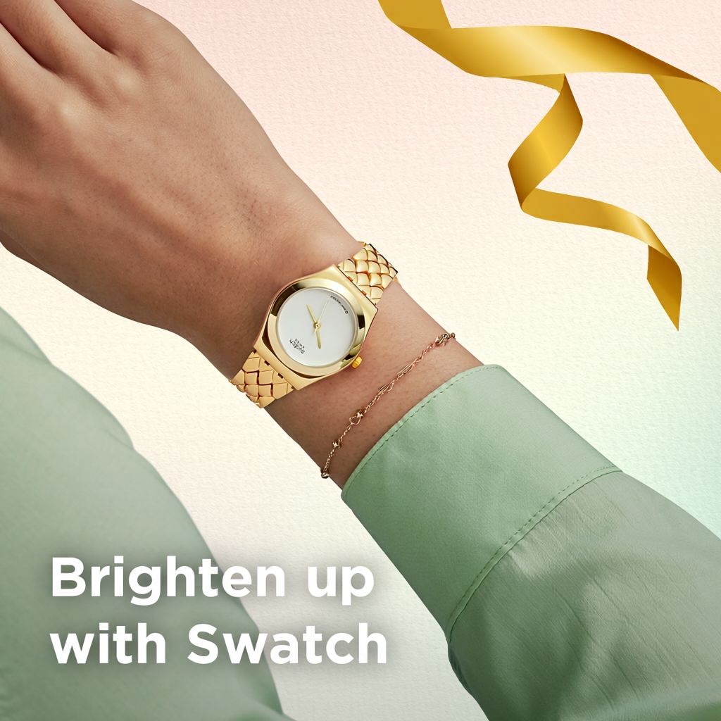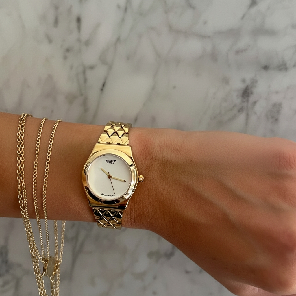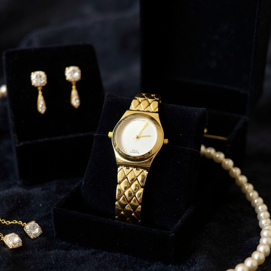 Cette montre se distingue par son boîtier rond couleur dorée aux lignes douces et harmonieuses, associé à un cadran blanc minimaliste qui offre une lecture claire et élégante de l’heure. Les aiguilles fines dorées ajoutent une touche de sophistication discrète, idéale pour un style chic et intemporel.