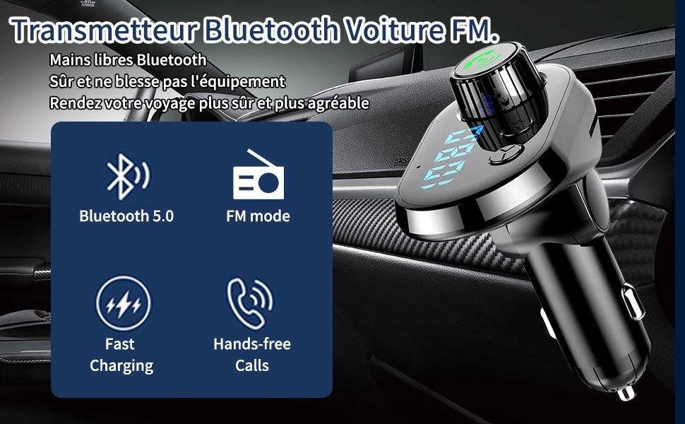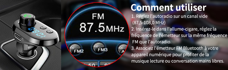 Développez la musique: vous pouvez transformer la musique et les appels vers votre autoradio sans aucun équipement ou modification supplémentaire. Ce transmetteur FM transfère de manière transparente votre téléphone et votre musique vers le système audio de votre voiture.