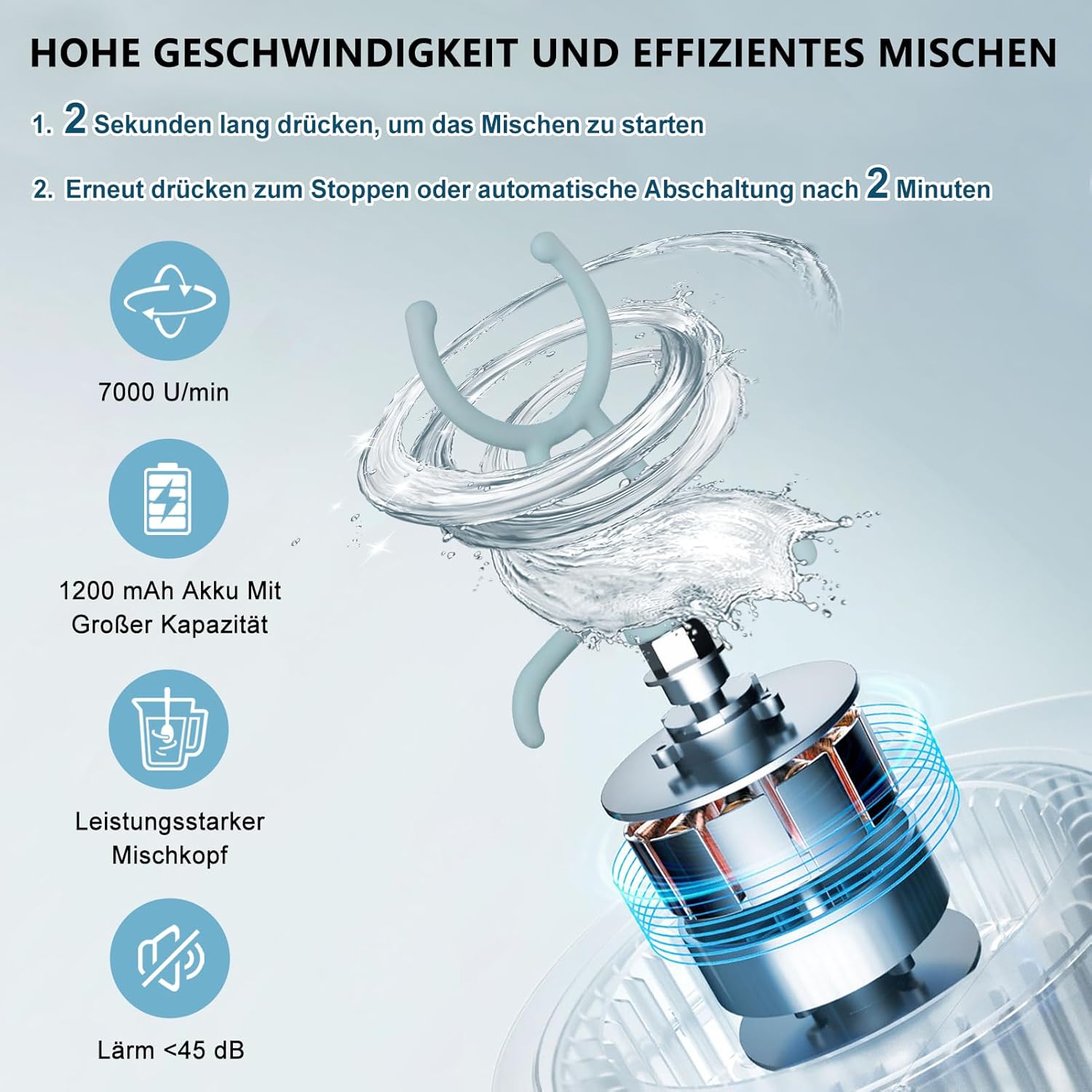 • Mélange efficace : maintenez le bouton enfoncé pendant 2 secondes pour commencer à mélanger. Le moteur puissant atteint jusqu'à 7000 tr/min et assure un mélange uniforme et sans grumeaux. Arrêtez le mélange en appuyant à nouveau sur le bouton ou attendez que le shaker s'arrête automatiquement après 2 minutes. Important : uniquement pour les liquides et les poudres de protéines, ne convient pas aux ingrédients solides tels que les glaçons ou les fruits.