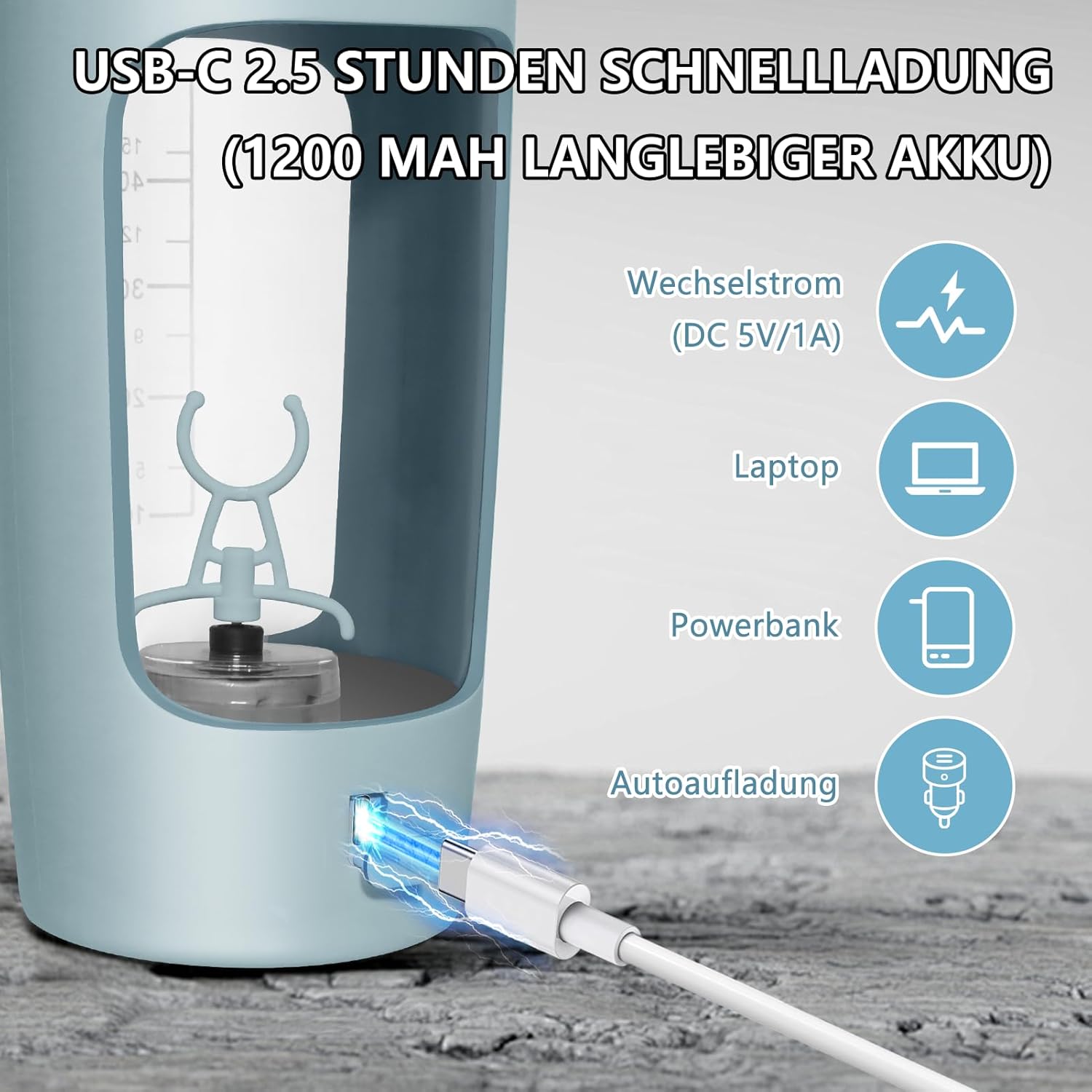• Shaker électrique rechargeable par USB : le shaker est équipé d'une batterie haute capacité de 1200 mAh qui peut être chargée à tout moment via n'importe quel port de type C. Le gobelet à shake ne nécessite que 2,5 heures pour être complètement chargé et peut être utilisé plus de 30 fois une fois chargé. La longue durée de vie de la batterie répond aux exigences du travail quotidien, des voyages, du sport et plus encore.